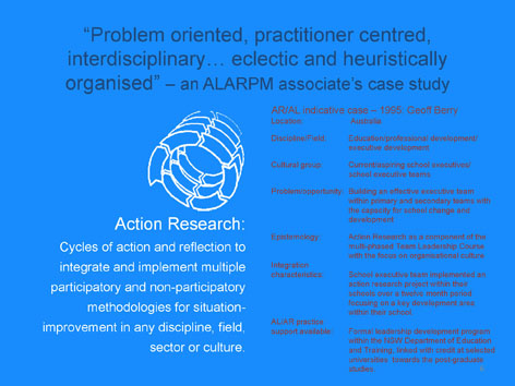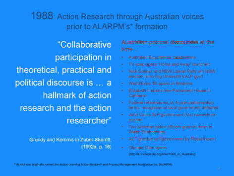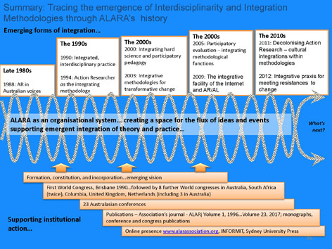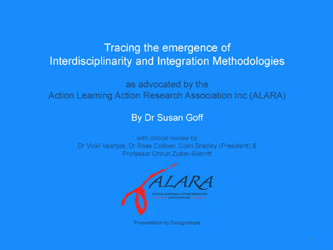 | Susan's poster presentation documents the developments in Action Learning and Action Research and the evolution of initially ALARPM (ALARA's predecessor) and more recently, ALARA, from the late 1980s to current times. |